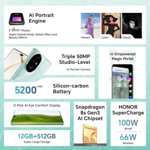 Experience the pinnacle of smartphone innovation with the HONOR 200, designed to revolutionize your mobile experience with its cutting-edge technology and elegant design. At the heart of the HONOR 200 is its Triple 50MP Studio-level Portrait Camera system, featuring a 50MP Portrait Main Camera, a 50MP Telephoto Camera, and a 50MP Portrait Selfie Camera. Each camera is equipped with advanced features like the 1/1.56-inch Sony Customized Large Sensor, HONOR x Sony IMX856 technology, and Dual OIS, ensuring every shot is sharp, detailed, and professional-grade.