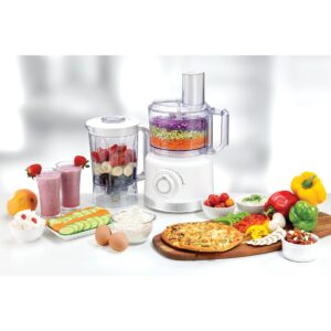 - LARGE CAPACITY: In addition to the food processor attachments, the unit also includes a blender pitcher and an ice-crushing blade, so you can whip up refreshing smoothies or crush ice quickly for your drinks; The blender pitcher has a 2 liter capacity, making it perfect for preparing large batches of your favorite juices, smoothies and shakes; It also comes with its own 2 liter food processing bowl and 2.3 liter blender jar to serve all your blending needs