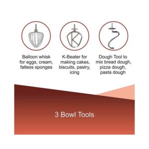 - 3 basic full metal bowl attachments: Dough hook can prepare dough (For all types of Indian and other breads and pizzas)