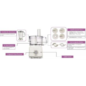 Kenwood Food processor FDP03, a 750W powerful motor along with 2L bowl capacity and 1.8L blender capcity ideal for easy chopping , making smoothies, shakes and soups. FDP03 comes with 2 speed + pulse function for flexible use control. Attachments- Chopper blase for easy chopping, Plastic blender for kneading bread and pastry mixes. This machine provides different doscs for grating and slice to prepare wide variety o dishes.