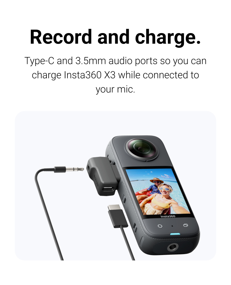 Designed for convenience and efficiency, the adapter also features a USB-C port that lets you charge your camera simultaneously while recording, so you never have to pause your shoot due to low battery. Its slim and unobtrusive design ensures it stays out of sight during 360° filming, maintaining the seamless look of your footage.