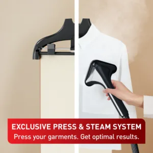 Ready in just 45 seconds, this steamer is perfect for both last-minute touch-ups and longer steaming sessions. Its 1.5L removable water tank ensures up to 40 minutes of continuous steam, and can be refilled mid-use for maximum convenience. The Press & Steam vertical board gives garments a stable surface for efficient one-handed steaming, while the large metal steam head with a precision tip tackles hard-to-reach areas like collars and cuffs.
