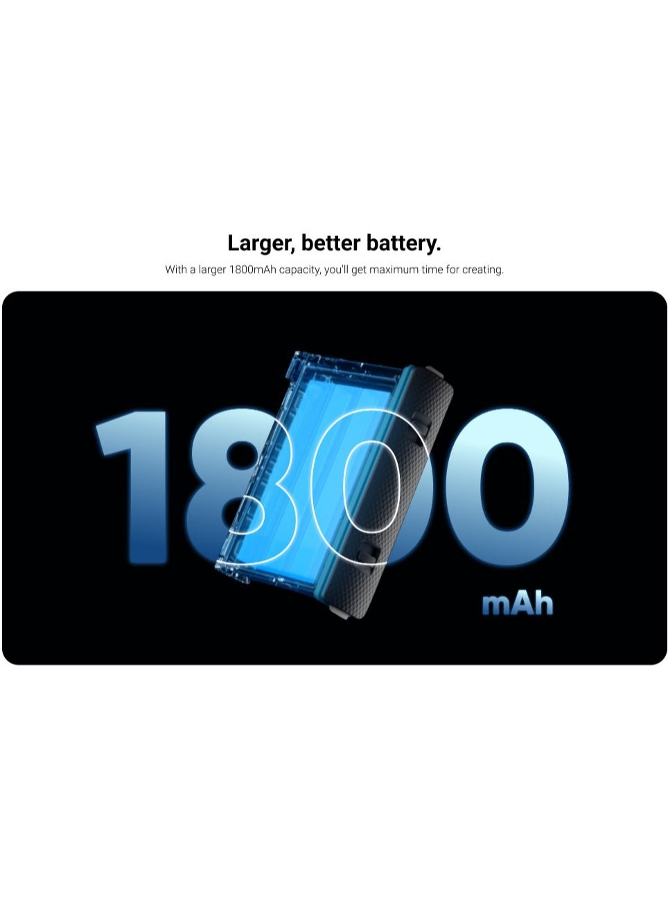 - Larger, better battery. With a larger 1800mAh capacity, you’ll get maximum time for creating.
